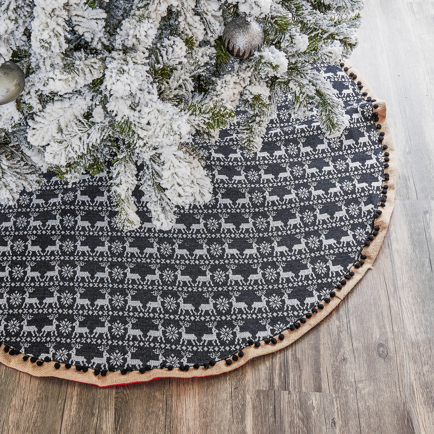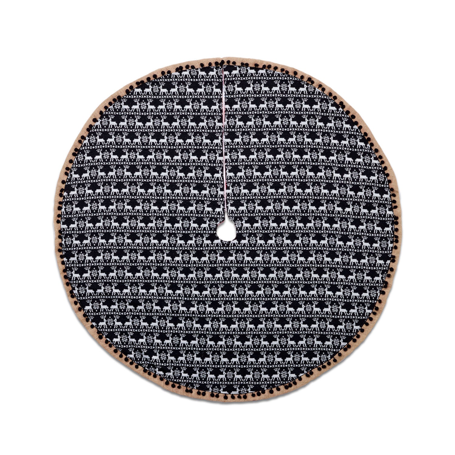 Give your Christmas tree some cozy lodge charm, with the Reindeer Print Tree Skirt. This festive tree skirt cozies up your tree with a fun, yet subtle reindeer pattern. The jute trim and black pom-pom detail lend extra dimension to your holiday decor, making it a fantastic backdrop for your Christmas presents.